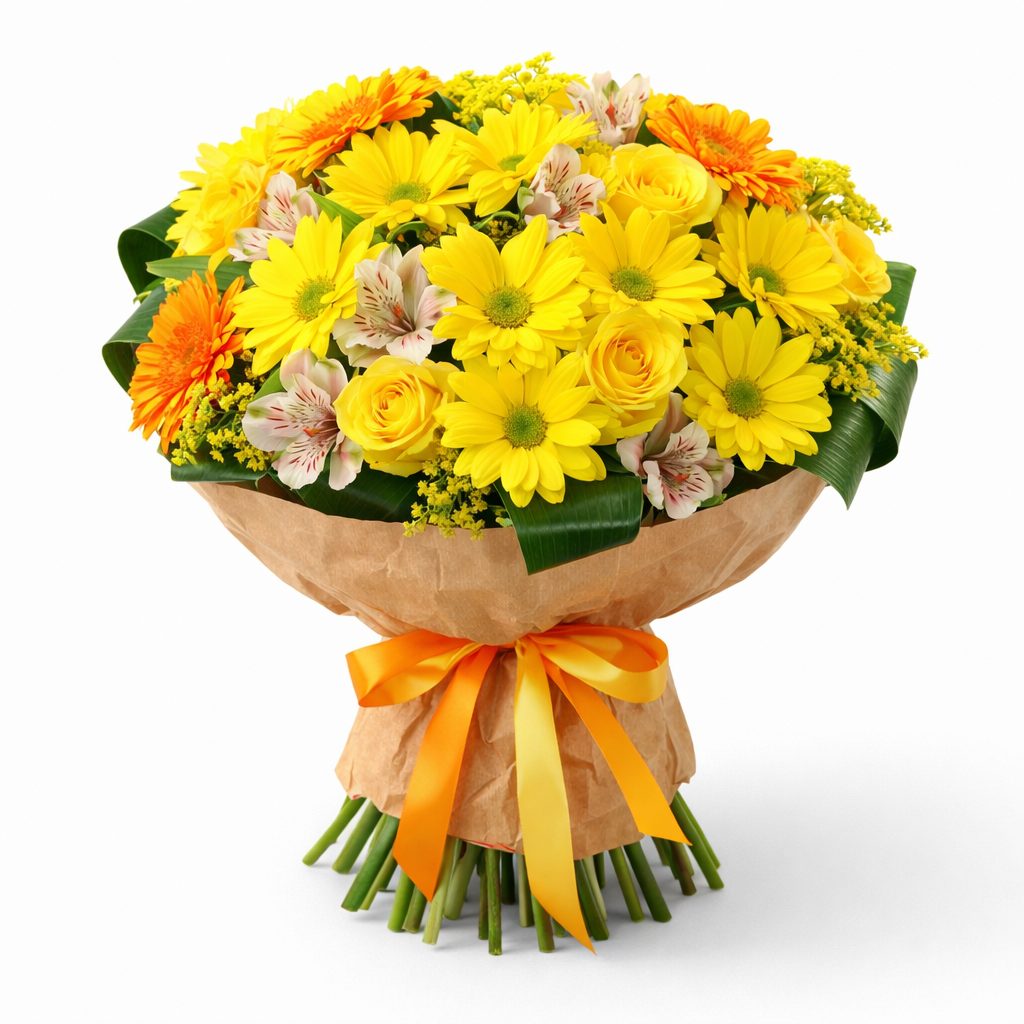 Яркие желтые хризантемы и розы, оранжевые герберы и белые альстромерии создают жизнерадостную композицию. Букет оформлен в крафт-бумагу и перевязан атласной лентой, добавляя элегантности. Возможны альтернативы упаковки: матовая плёнка или декоративная сетка. Прекрасный выбор для подарка на день рождения для любимой.