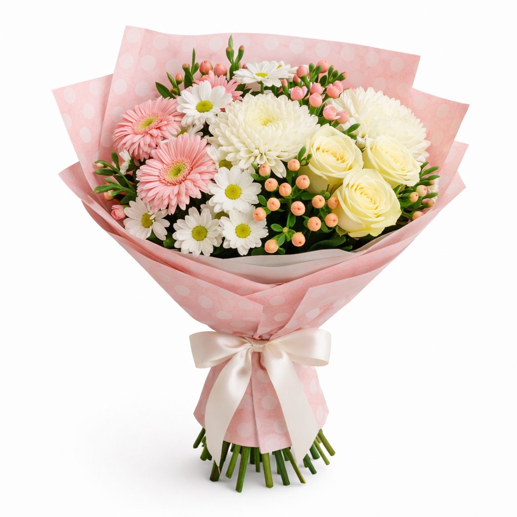 Кремовые розы, розовые герберы и белые хризантемы создают гармоничный и нежный ансамбль, дополненный розовыми альстромериями и гиперикумом. Букет оформлен в матовую плёнку и перевязан атласной лентой, что придаёт ему изысканность. Возможны варианты упаковки с крафт-бумагой или декоративной сеткой. Прекрасный выбор для подарка на день рождения для любимой или жены.