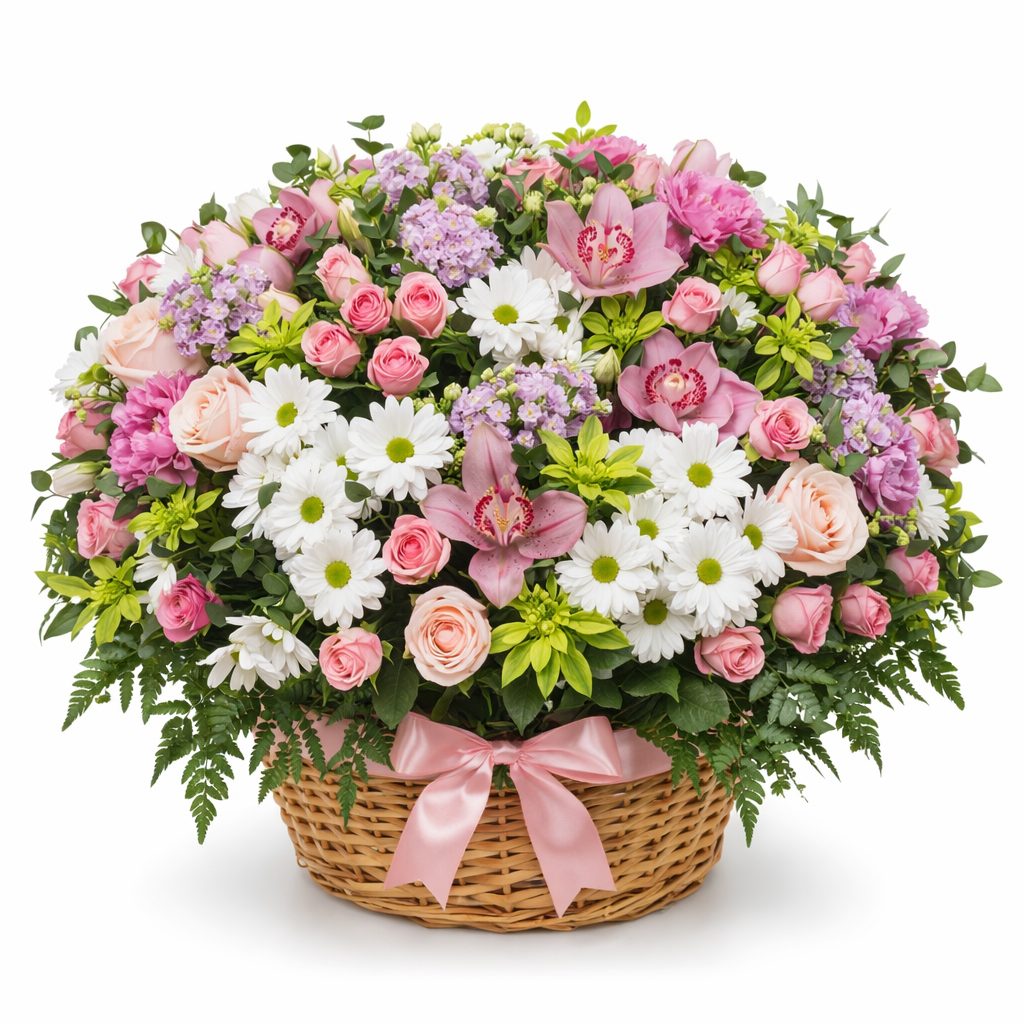 Розовые кустовые розы и орхидеи, белые альстромерии и хризантемы, розовые пионы и солидаго создают нежную и гармоничную композицию. Цветы размещены в плетёной корзине, что придаёт им особую элегантность. Альтернативное оформление возможно в корзине из лозы или ротанга. Прекрасный подарок для любимой на день рождения или годовщину.