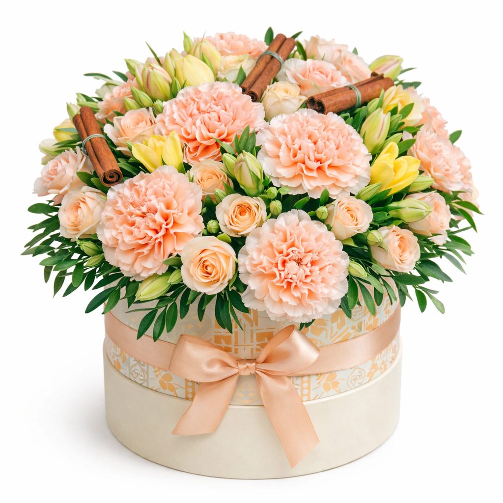 Кремовые гвоздики и альстромерии, дополненные кустовыми розами и желтыми фрезиями, создают нежную и изысканную композицию. Цветы оформлены в элегантной шляпной коробке с атласной лентой. Возможны альтернативы оформления: бархатная коробка или коробка с принтом. Прекрасный подарок для любимой на годовщину или день рождения.
