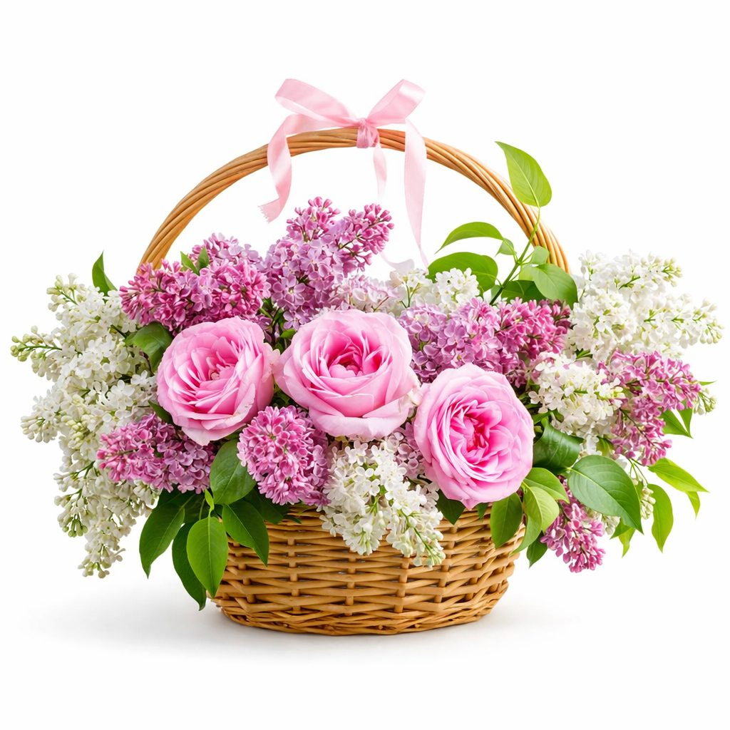 Эта изысканная композиция сочетает в себе розовые одноголовые розы и белую с розовой сирень, создавая атмосферу утренней свежести. Корзина из лозы придаёт естественность и лёгкость. Возможны альтернативы оформления: корзина с тканевой отделкой или плетёная корзина. Прекрасный подарок для любимой на годовщину или для мамы на День матери.
